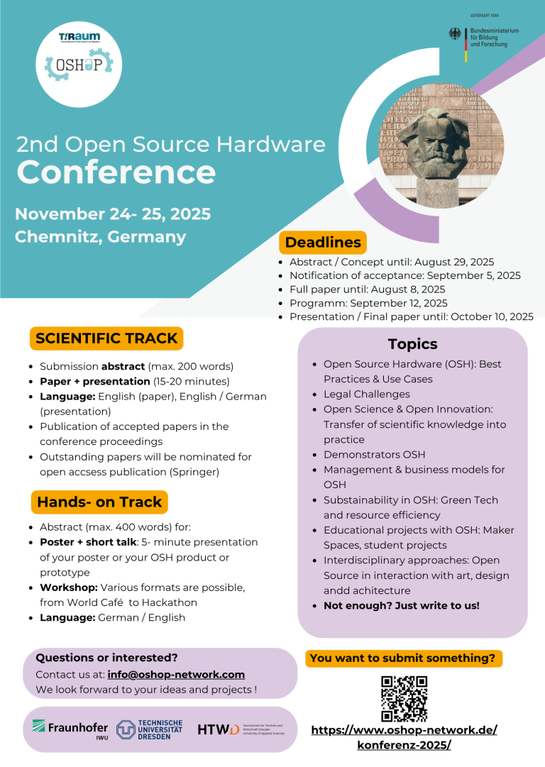 According to the conference organisers, the Second Open Source Hardware Conference (OSHOP 2025) is now open for global submissions. The conference will be held on 24-25 November 2025 in Chemnitz, Germany, focusing on research progress, collaborative innovation and practical applications in the field of open source hardware (OSH), with the aim of further promoting cross-border exchanges and systematic implementation of open source hardware concepts around the world.